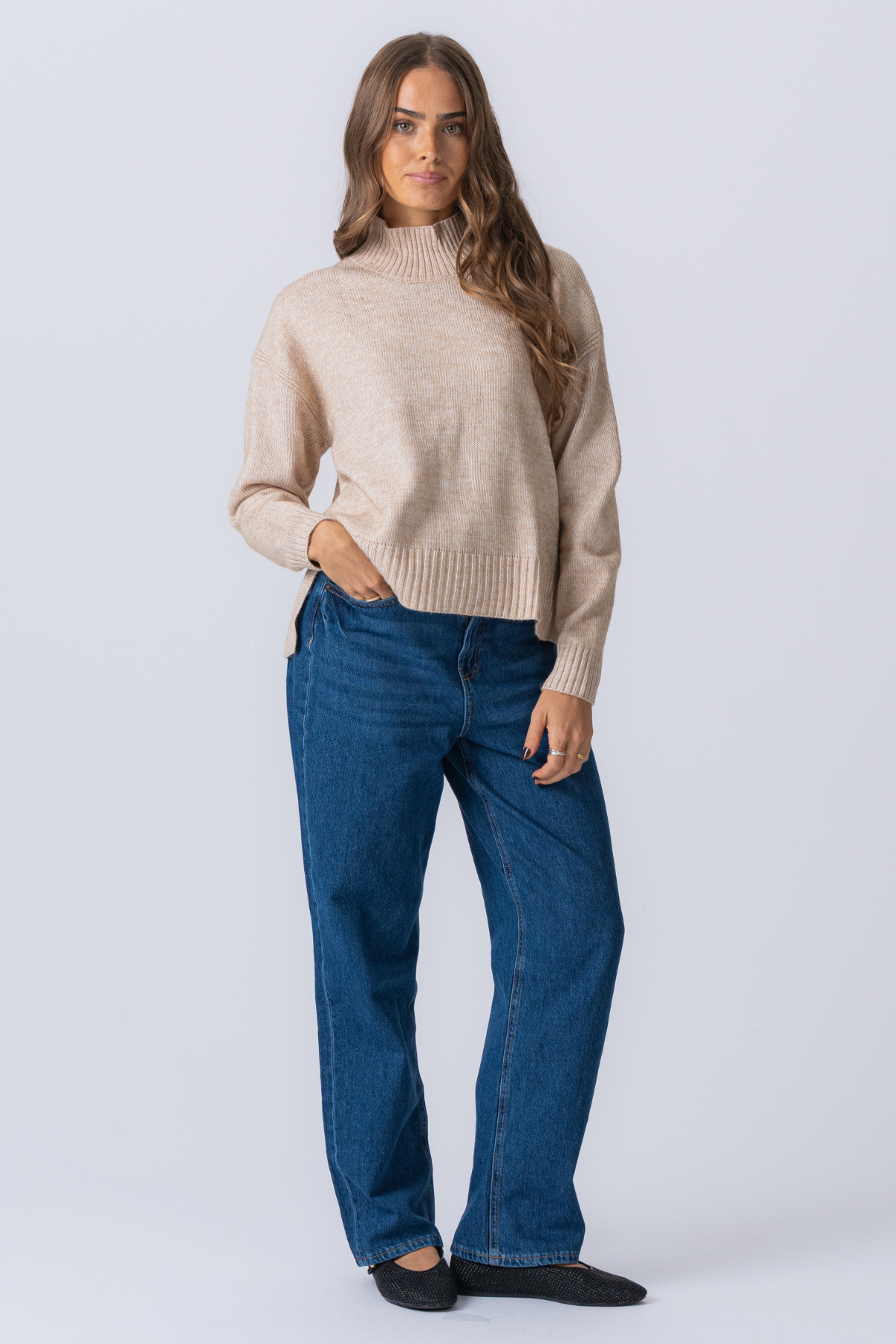 Embrace Cozy Elegance with TeeShoppen's Oversized Knitted Polo-Neck Jumper - Beige for Women