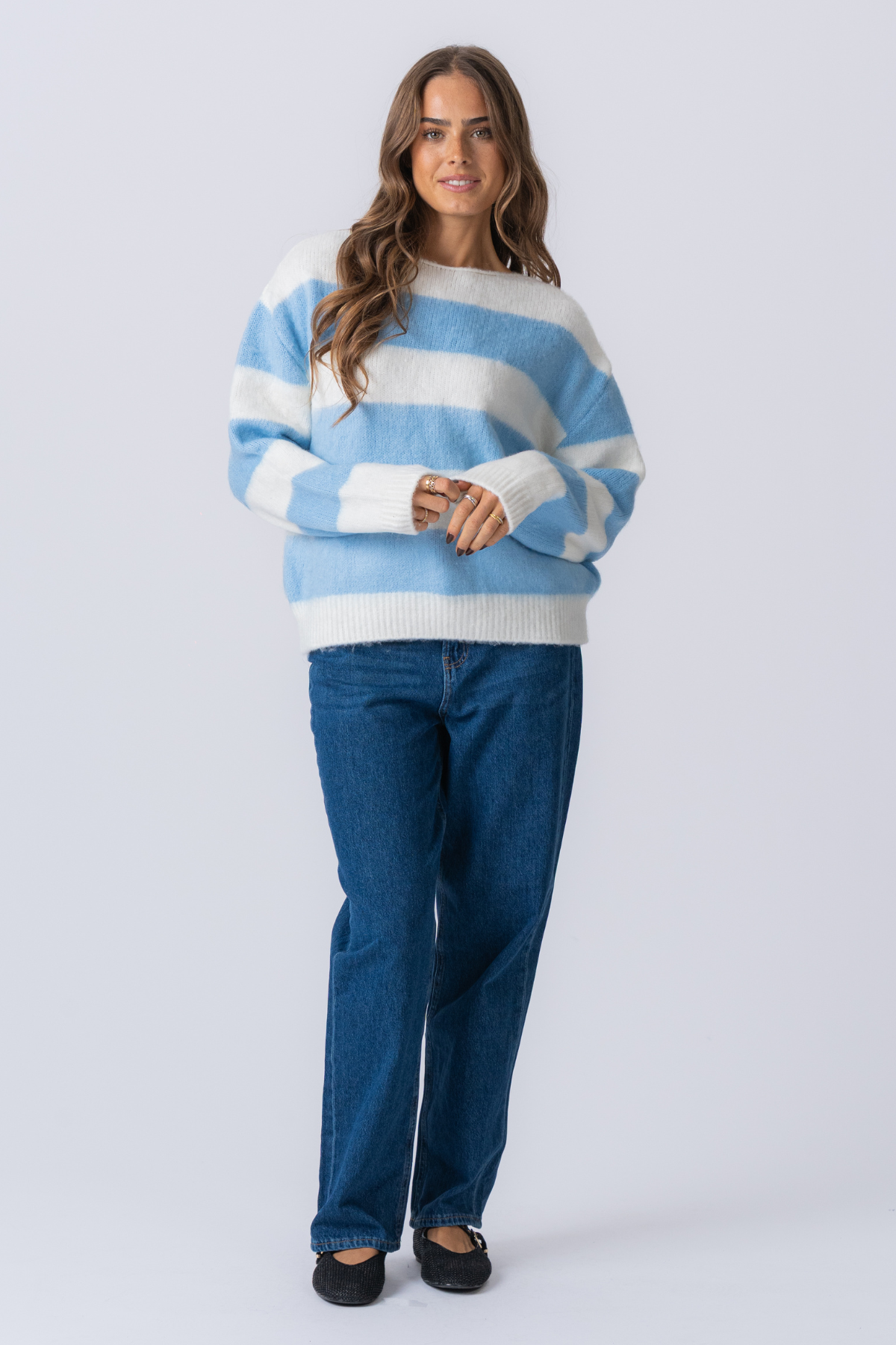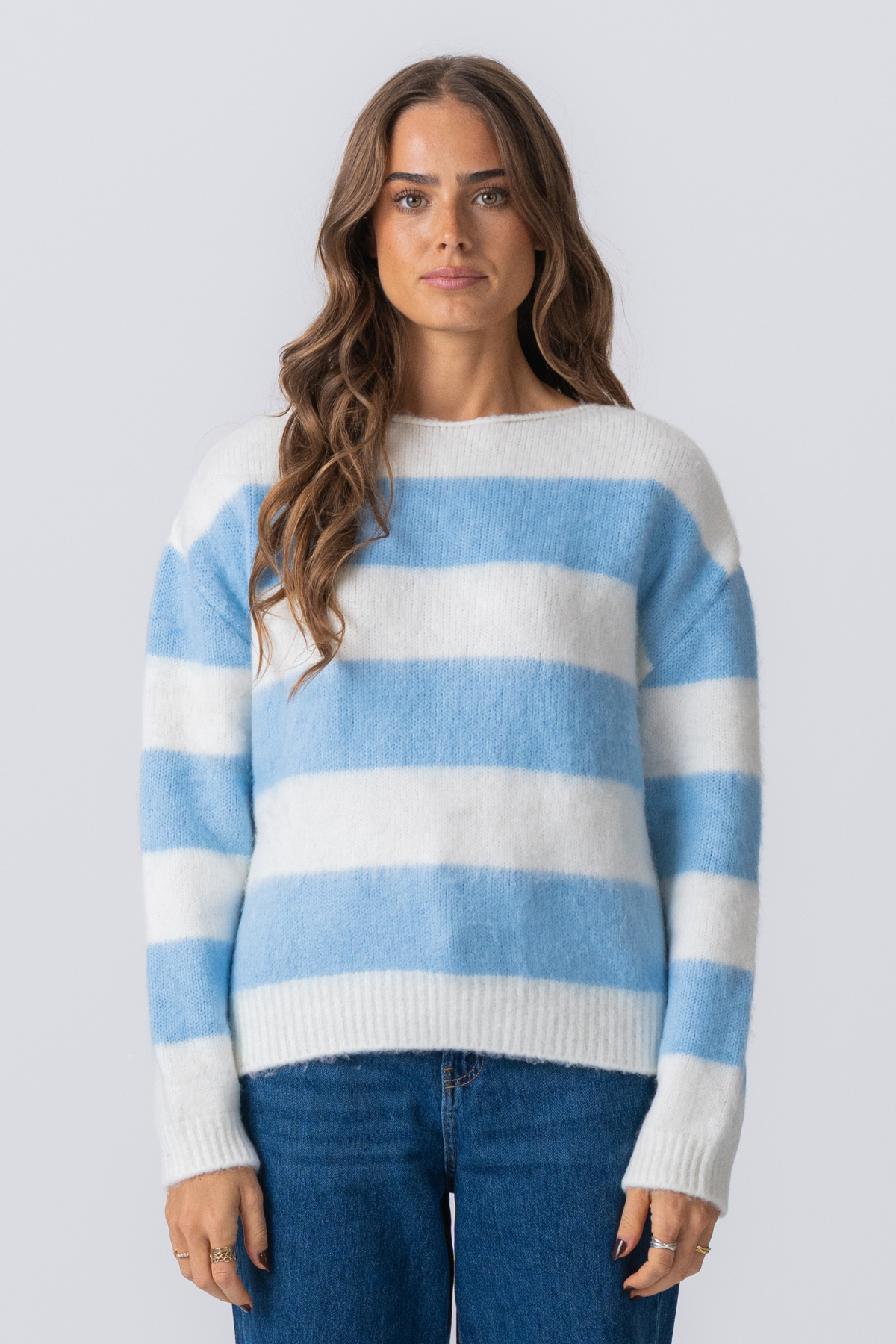 Meet the Celina Striped Knit Sweater, your new go-to for timeless style and incredible comfort. Designed for the modern woman who values both sophistication and ease, this sweater captures the essence of chic, everyday luxury. The serene sky blue stripes against a crisp white background create a classic, nautical-inspired look that feels fresh, airy, and endlessly versatile. Imagine cozying up on a cool morning or enjoying a breezy evening walk—the Celina sweater is the perfect companion for life's beautiful moments.