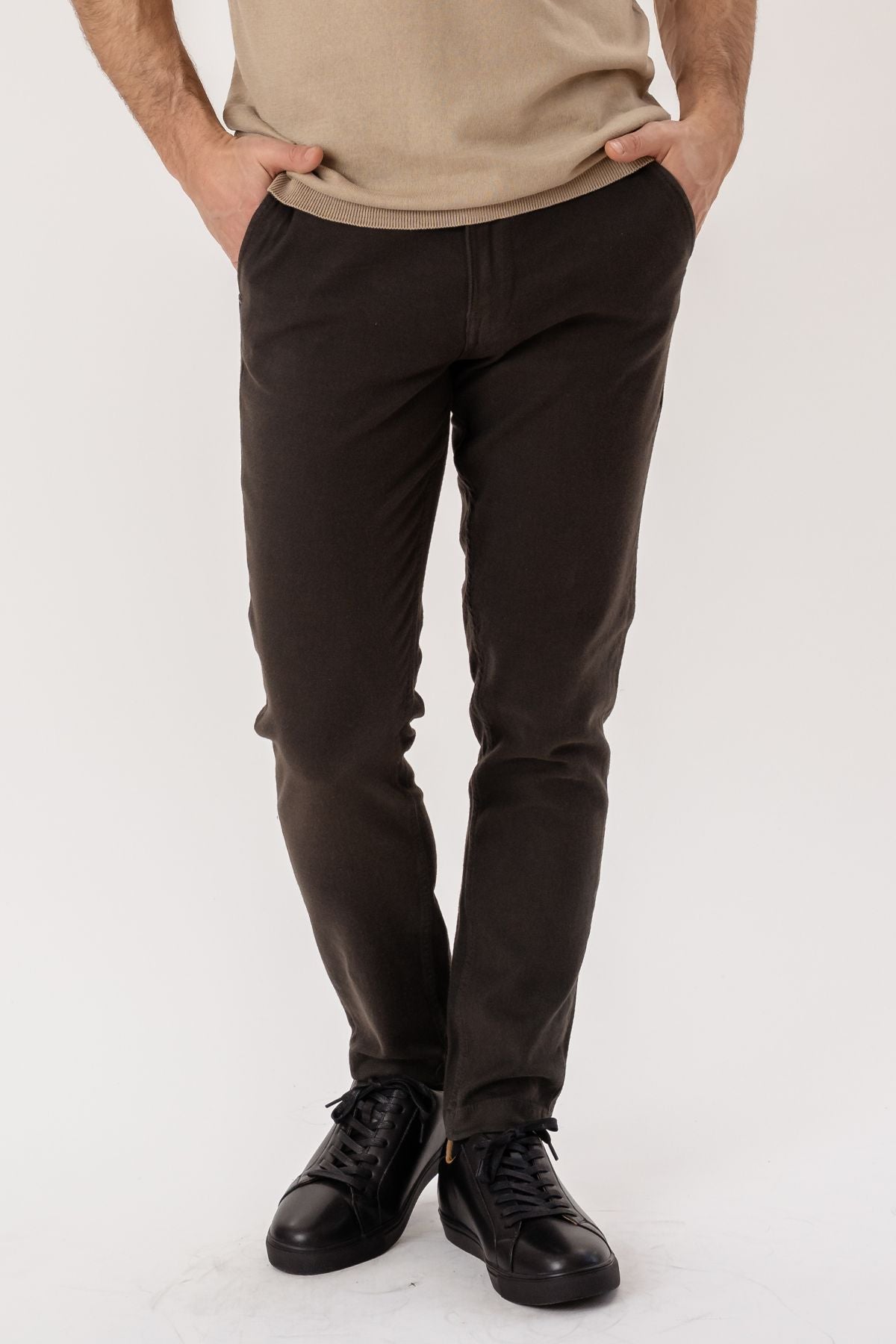 Crafted from a carefully selected mix of 98% cotton and 2% elastane, these pants provide the perfect balance between softness and stretch. The dark brown color offers a versatile base that pairs well with various tops and shoes, making it an indispensable part of your wardrobe.