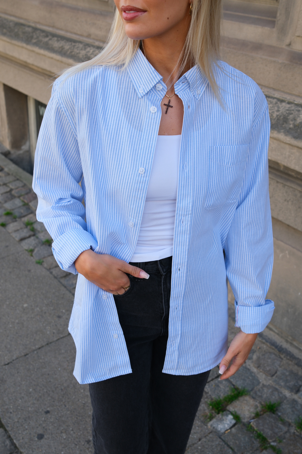 Nesenstantis dryžuotas raštas: Klasikinės šviesiai mėlynos ir baltos vertikalios juostelės yra be galo universalios, vizualiai pailginančios jūsų rėmą ir prideda preppy rafinuotumo prisilietimą.