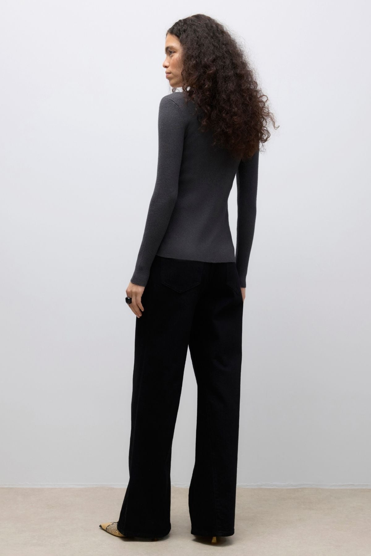 Sudėtingas melange megztas: Tamsiai pilkos spalvos „Melange“ pynimas prideda vaizdinę tekstūrą ir prašmatnų, modernų prisilietimą prie šio esminio kūrinio.